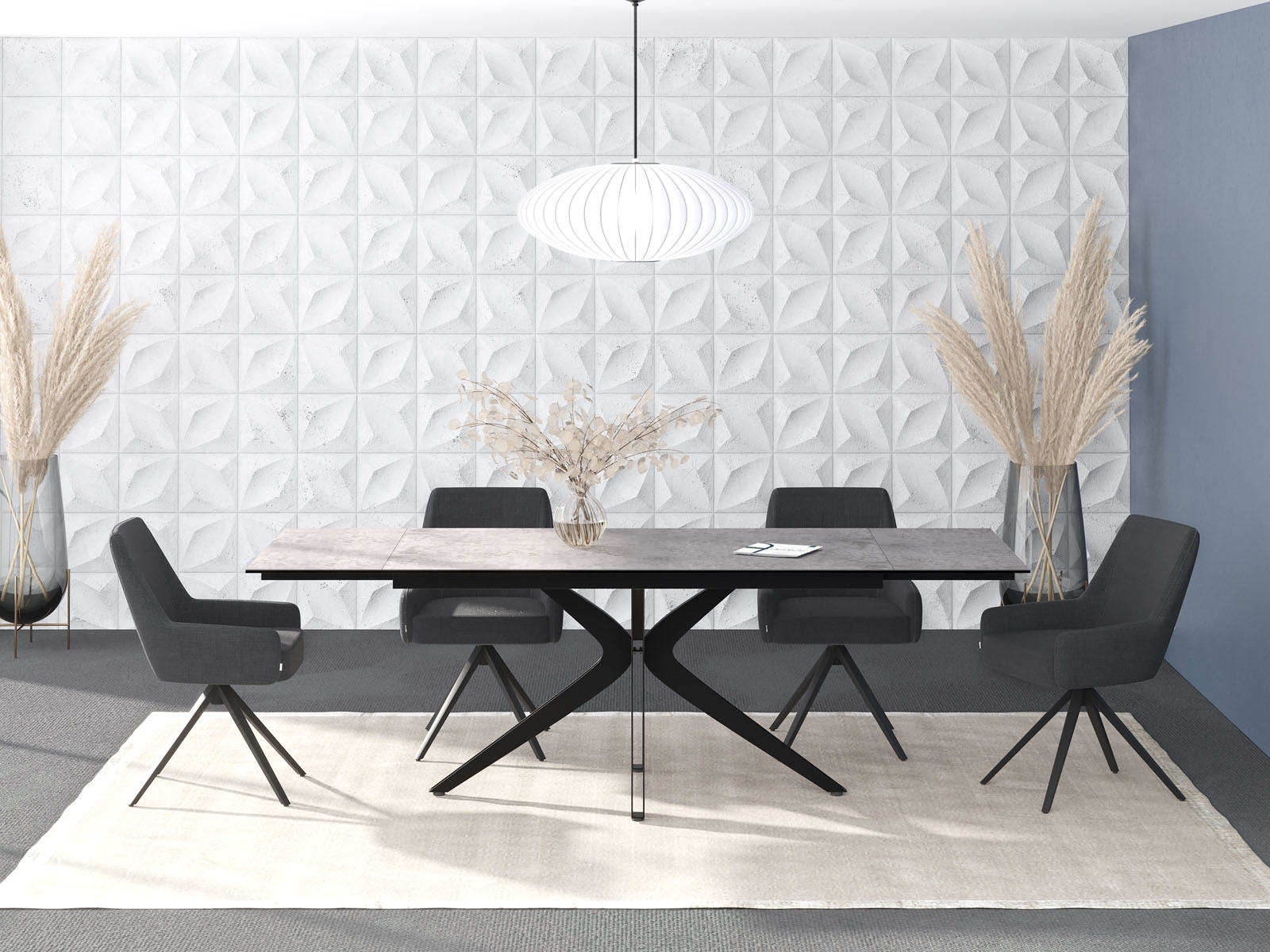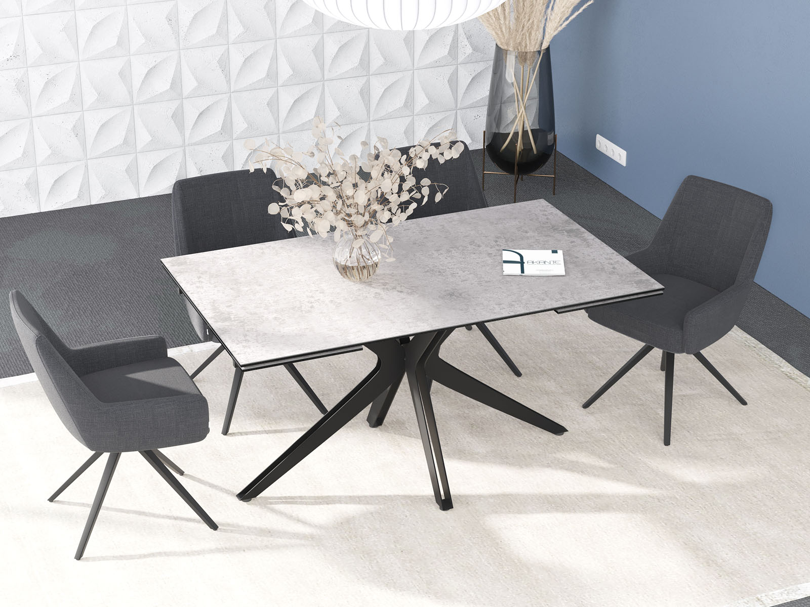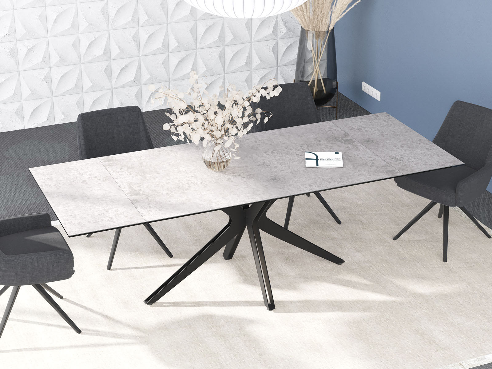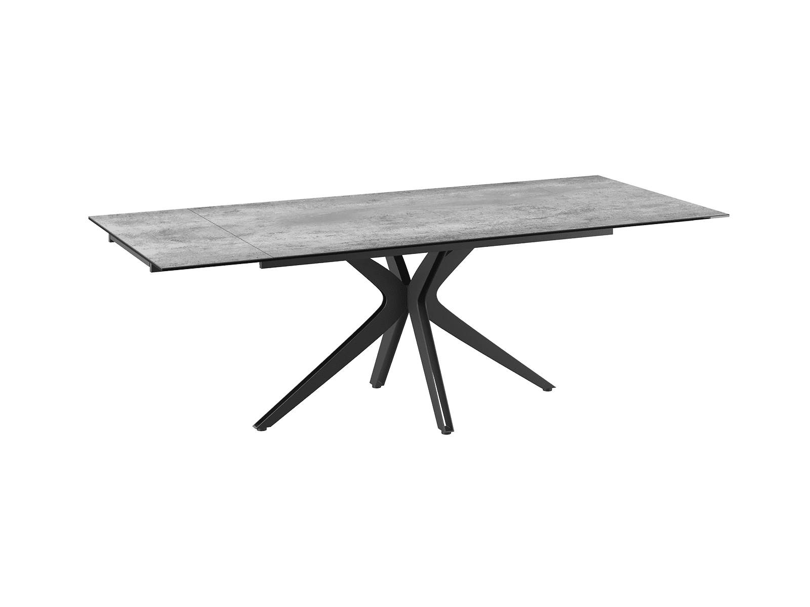 Influence, une grande table de repas conviviale qui apportera de la douceur à votre salle à manger. Elle est pratique, grâce à ses deux rallonges de 40 cm aux deux extrémités de la table et design avec son piétement raffiné en forme d’étoile en acier laqué noir mat. Son plateau en céramique silver de 3 mm d’épaisseur est collé sur un vitrage de 8 mm ce qui lui apporte une réelle solidité. Influence est facile d’entretien, parfait pour vous accompagner au quotidien.