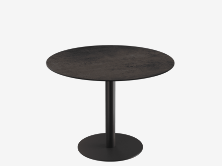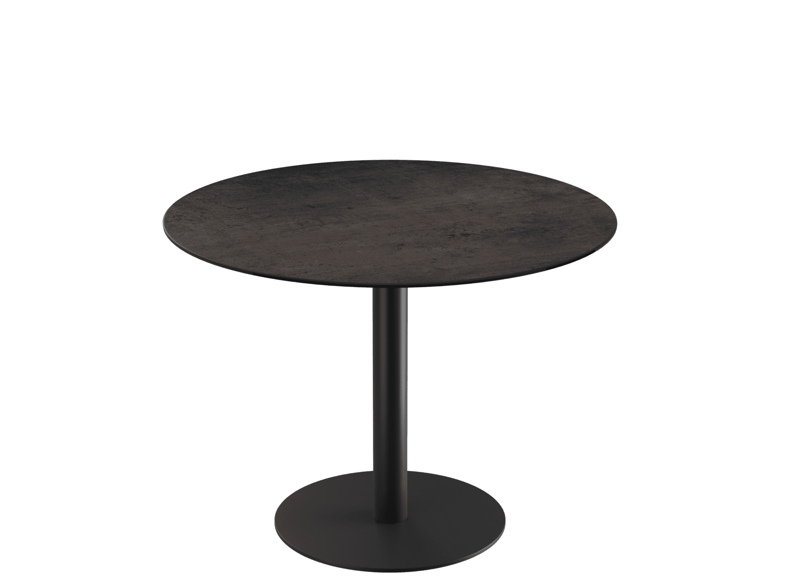 Orlando est une table de repas de 75cm de hauteur avec un plateau en céramique acier de 3mm collée sur un verre de 8mm. Son diamètre est de 100cm. Son piétement est en acier laqué noir mat.