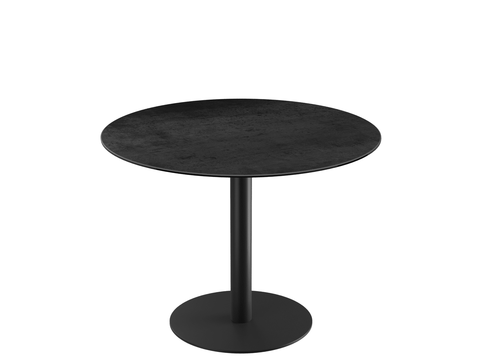 Orlando est une table de repas de 75cm de hauteur avec un plateau en céramique titane de 3mm collée sur un verre de 8mm. Son diamètre est de 100cm. Son piétement est en acier laqué noir mat.